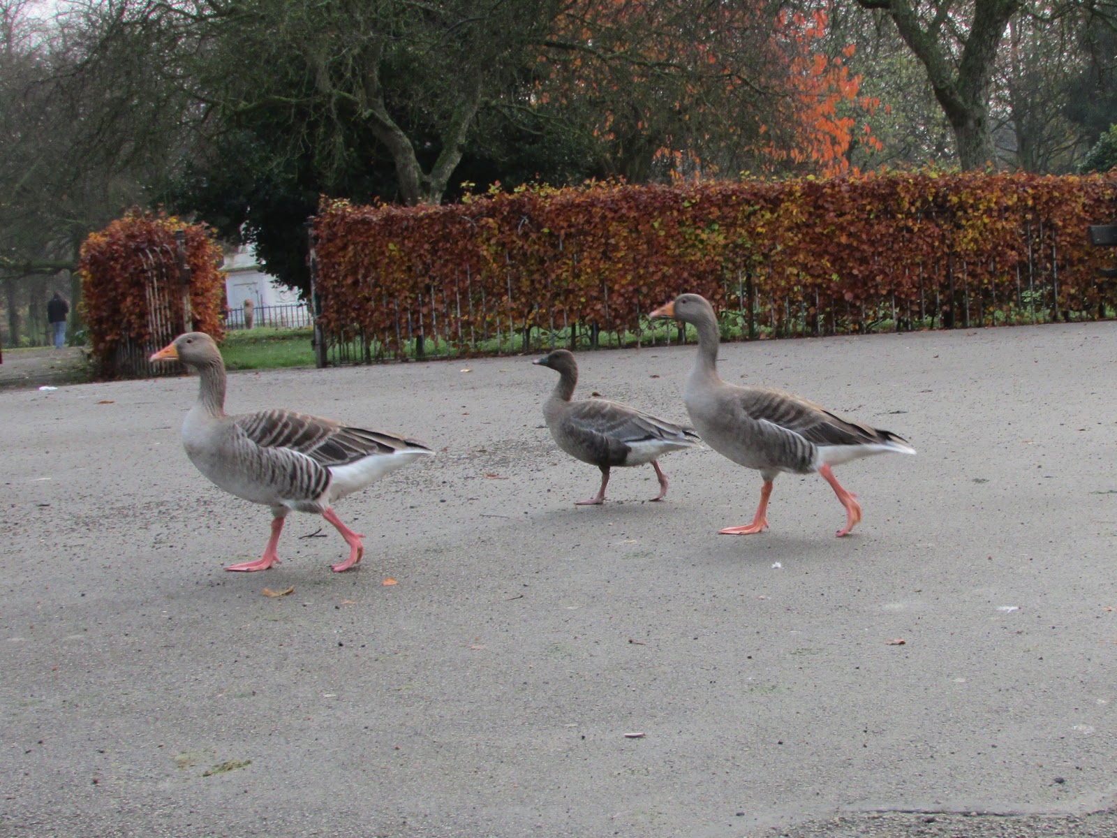 On my way to work, walking through the park, a flock of Canada Geese and another of Greylag geese were about. While counting them I noticed a much smaller goose, a Pinkfoot, amongst the greylags. They have small bills, marked with pink, much darker head, contrasting with the slaty back. I think this individual was a young bird born this past summer, as you can see two types of feathers in its flanks and back, as the larger adult feathers, with a pale edge, have started to grow. The furrows that adorn the neck of adult geese are not yet sharply defined. The goose wasn't welcome and was often lunged at by the Greylags. Surprisingly, it was quite relaxed in the park, despite proximity to people, and it got very close to me as it followed the other geese across the lake and then to the grass to feed.