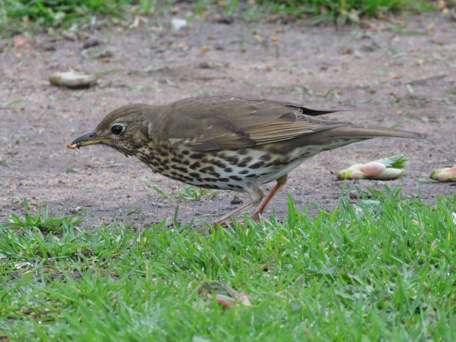 The thrushes are now feeding chicks, and there is a sense of urgency when they look for food. They would be shy when not breeding, but now they feed just by you, oblivious to their surroundings. This Song Thrush stood and run, alternatively, on the grass near me, when feeding.